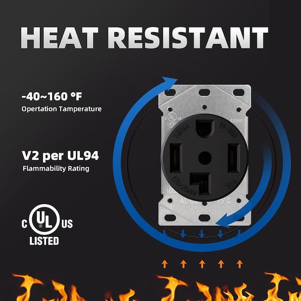 30 Amp 125/250V, NEMA 14-30R Flush Mount Power Outlet, Single Straight Blade Range and Dryer Outlet Grounding, Black