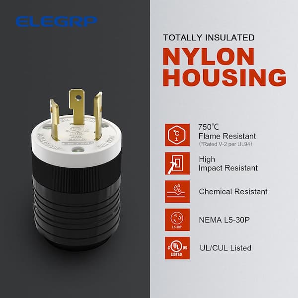 30 Amp 125-Volt NEMA L5-30P Locking Plug, Industrial Grade Grounding Heavy-Duty, Black/White