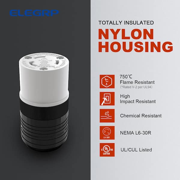 30 Amp 250-Volt NEMA L6-30R Locking Connector, Industrial Grade Grounding Heavy-Duty, Black/White