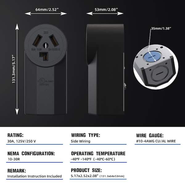 30 Amp125V, NEMA 10-30R Surface Mount Power Outlet, Single Straight Blade Range and Dryer Outlet Non-Grounding, Black
