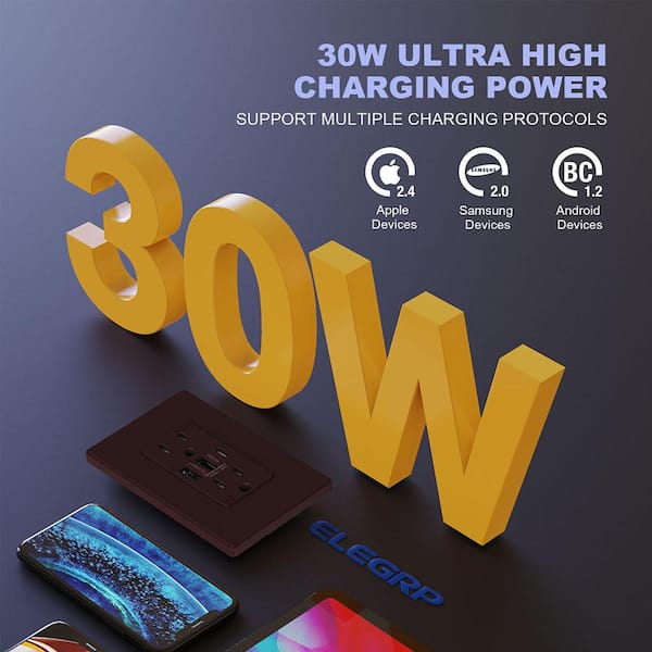 30-Watt 15 Amp 3-Port Type C and Dual Type A USB Duplex USB Wall Outlet, Wall Plate Included, Brown (2-Pack)