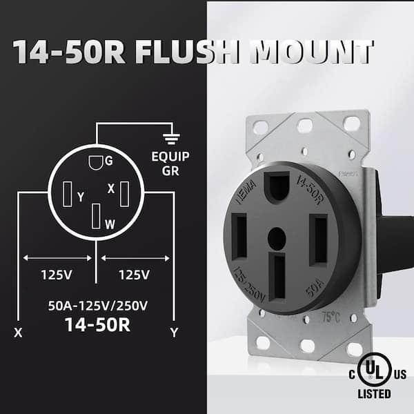 50 Amp 125/250V, NEMA 14-50R Flush Mount Power Outlet, Single Straight Blade Range and Dryer Outlet Grounding, Black