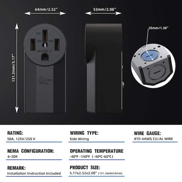 50 Amp 125/250V, NEMA 14-50R Surface Mount Power Outlet, Single Straight Blade Range & Dryer Outlet Grounding, Black
