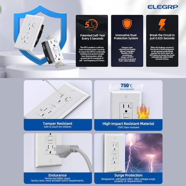 GFCI Outlet Self-Test, 15 Amp 125V Weather Resistant Duplex wall outlet, with Glossy Wall Plate, UL Listed, White 10PC