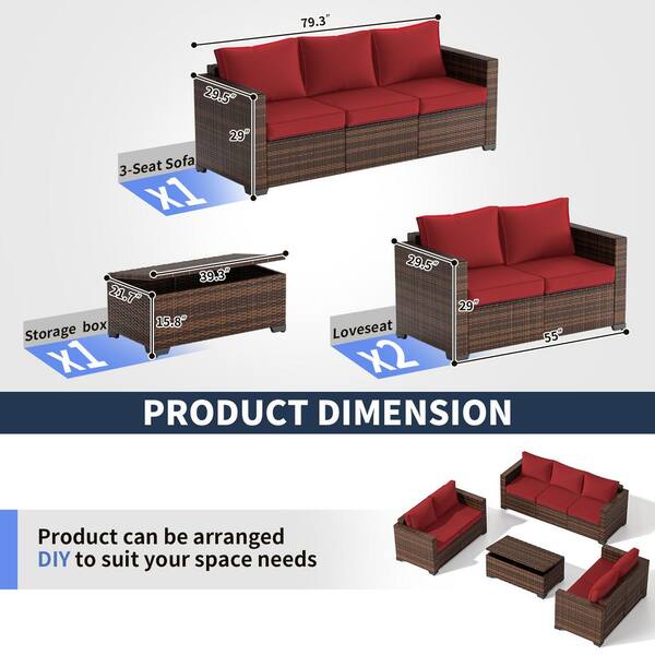 4-Piece 7 Seat Wicker Outdoor Patio Conversation Deep Seating Sofa Set with Red Cushions, Loveseat, Storage Box