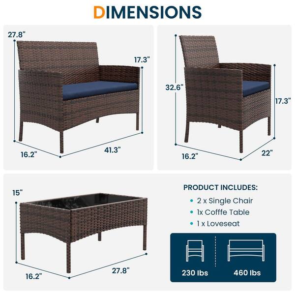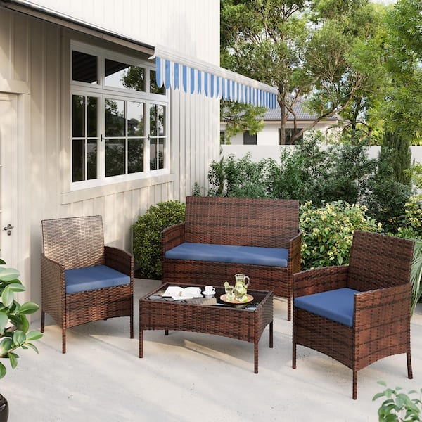 4-Piece Brown Wicker Patio Conversation Set with Navy Cushions and Coffee Table