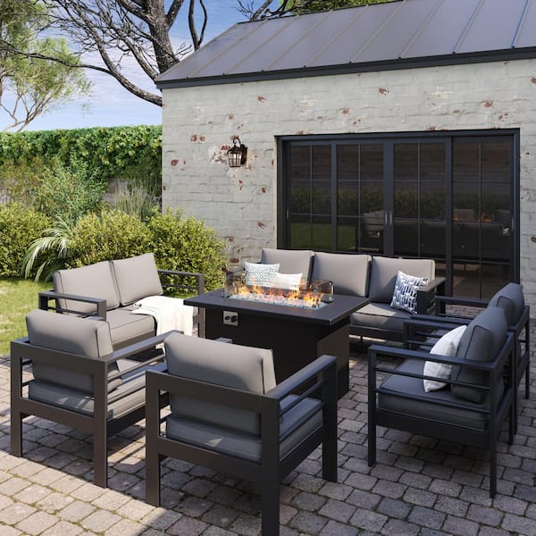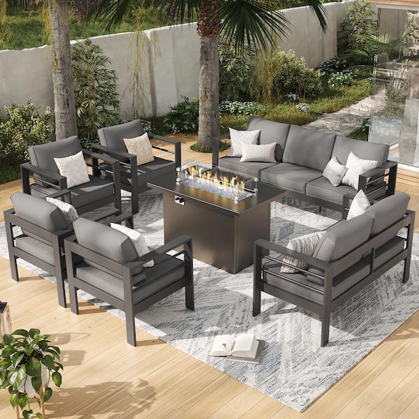 7-Piece Charcoal Gray Aluminum Patio Conversation Set with Gray Cushions and Fire Pit