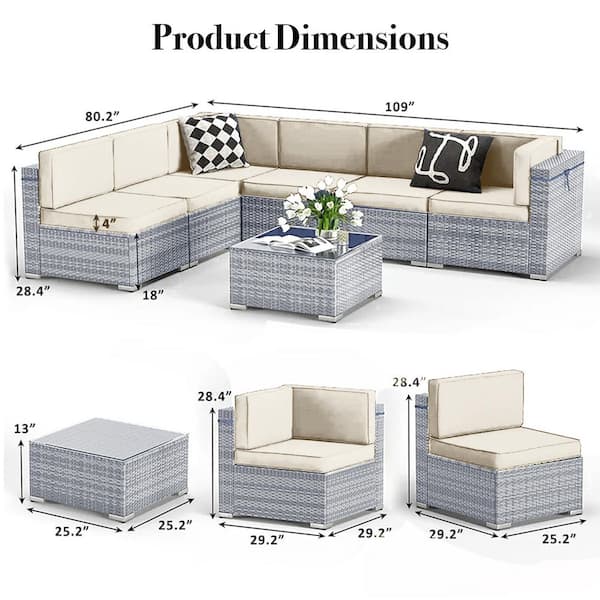 7 Seat 6-Piece Wicker Outdoor Patio Conversation Sectional Deep Seating Sofa Set with Cream Cushions, Coffee Table