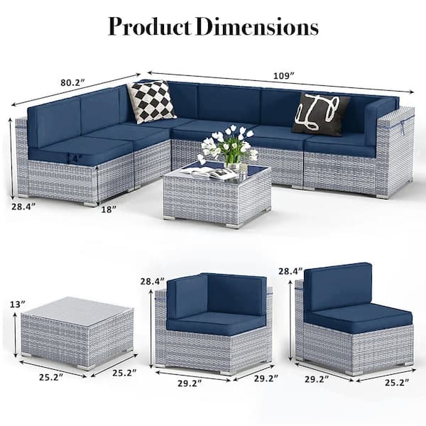 7 Seat 6-Piece Wicker Outdoor Patio Conversation Sectional Deep Seating Sofa Set with Navy Cushions, Coffee Table