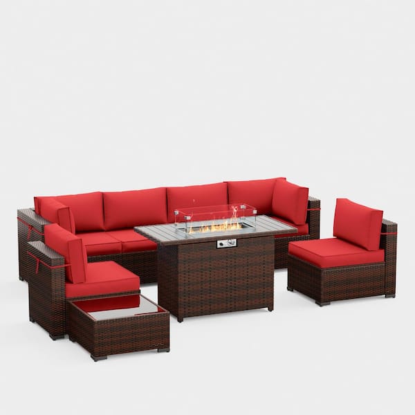 Brown 8-Piece Wicker Patio Conversation Set With Red Cushions