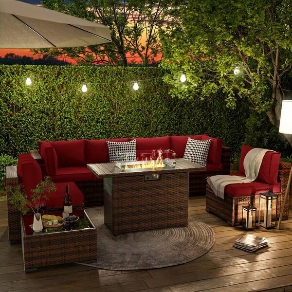 Brown 8-Piece Wicker Patio Conversation Set With Wine Red Cushions