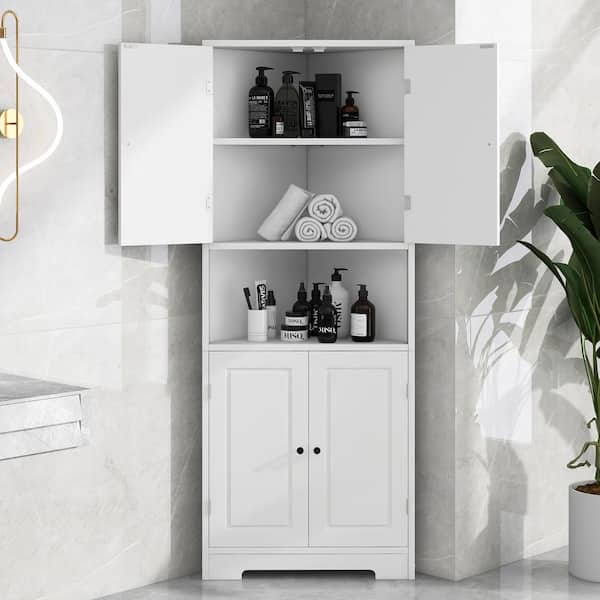 25 in. W x 14.96 in. D x 63.18 in. H White Tall Corner Linen Cabinet with 4-Doors Adjustable Shelf and Open Shelf