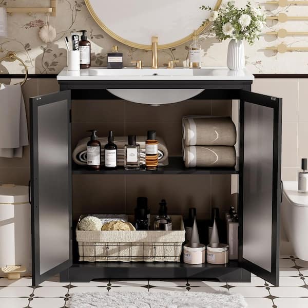 30 in. Single Sink Freestanding Black Bath Vanity with White Ceramic Top and 2-Glass Door and Adjustable Shelf Assembled