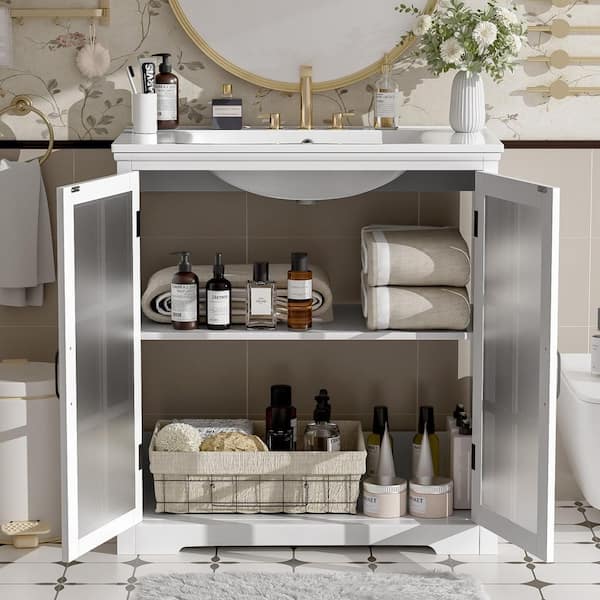 30 in. Single Sink Freestanding White Bath Vanity with White Ceramic Top and 2-Glass Door and Adjustable Shelf Assembled