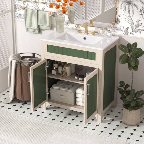 30 in. W x 18 in. D x 33.85 in. H Single Sink Freestanding Bath Vanity in Green with White Ceramic Top and Storage