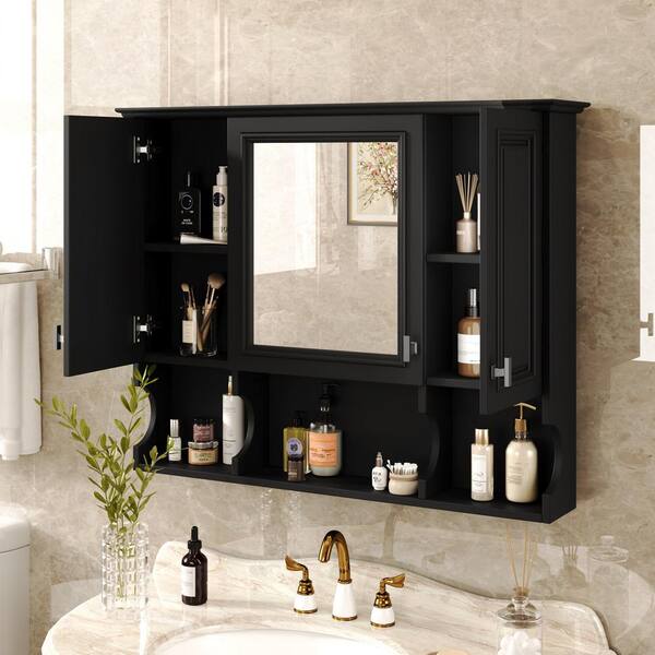 35 in. W x 28.7 in. H Rectangular Black MDF Surface Mount Medicine Cabinet with Mirror and Open Shelves