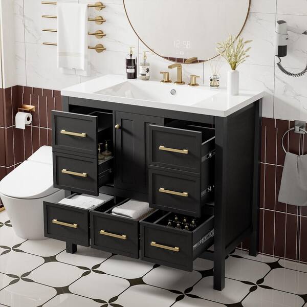 36 in. W x 18 in. D x 34 in. H Single Sink Freestanding Bath Vanity in Black with White Resin Top and Storage