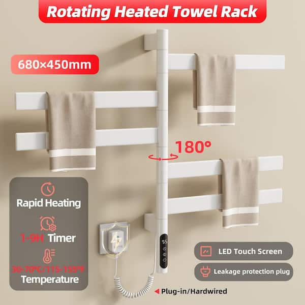 5 Bar Wall Mounted Plug-in/Hardwired Towel Warmer Rotating Heated Rack in White with Intelligent Touch Screen Timer