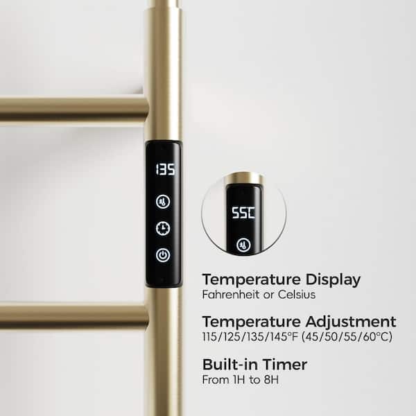 6 Bar Wall Mounted Plug-in/Hard-Wired Towel Warmer Heated Rack in Brushed Gold with Intelligent Touch Screen Timer