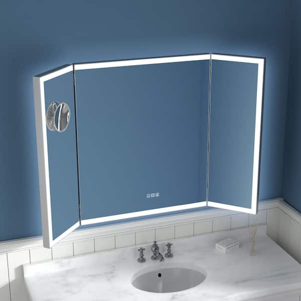 54 in. W x 36 in. H Rectangular Framed Tri-fold Wall LED Bathroom Vanity Mirror with Front Light and Backlict in Nickel