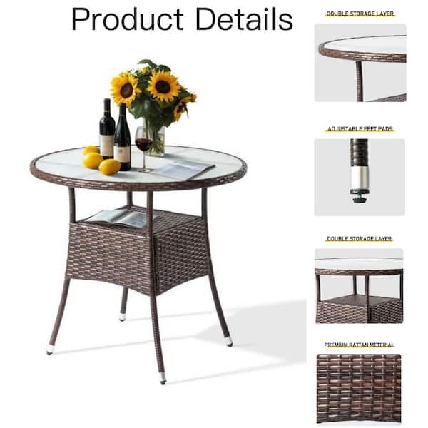 31.5 in. Round Outdoor Dining Table-All-Weather Rattan and Glass Top for Patio, Deck, or Poolside (Brown)