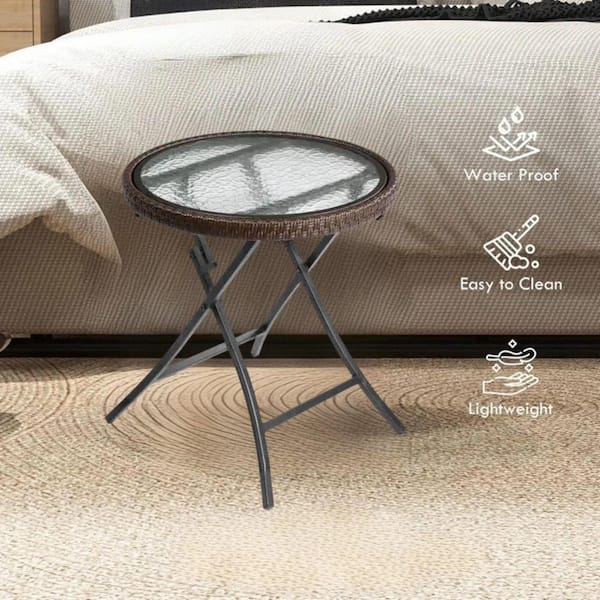 Round Rattan Side Table-Foldable Outdoor Wicker Table with Tempered Glass Top for Patio, Garden, Balcony (Brown)