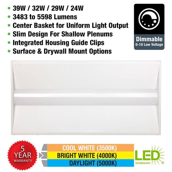 2 ft. x 4 ft. Center Basket Integrated LED Troffer Light Drywall Mount Kit 3500K 4000K 5000K 39W/32W/29W/24W (4-Pack)