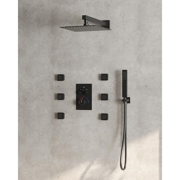 7-Spray 12 in. Thermostatic Wall Bar Shower Systems with Handheld 2.5 GPM in Matte Black (Valve Included)