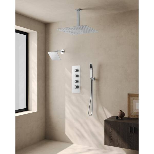 7-Spray 16 and 6 in. Dual Shower Heads Ceiling Mount Fixed and Handheld Shower Head in Brushed Nickel (Valve Included)