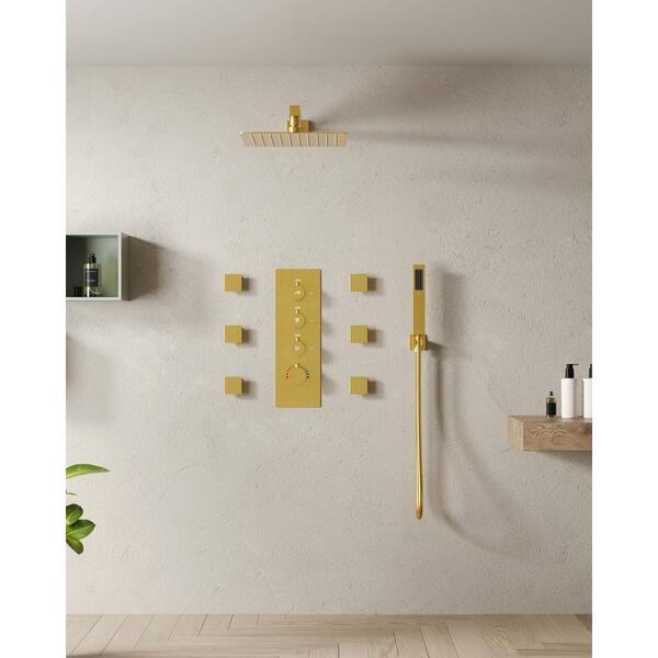 7-Spray Patterns Thermostatic 12 in. Wall Mount Dual Shower Heads with 6-Jet in Brushed Gold (Valve Included)