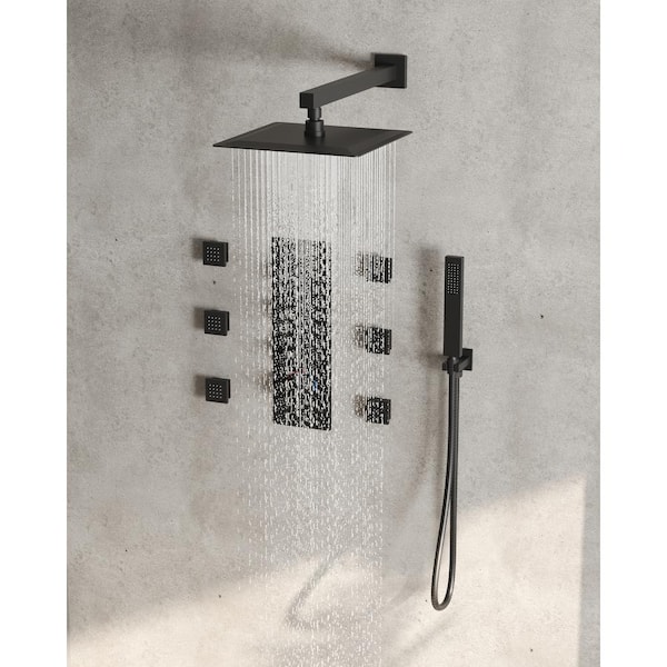 7-Spray Patterns Thermostatic 12 in. Wall Mount Rain Dual Shower Heads with 6-Jet 2.5GPM in Matte Black (Valve Included)