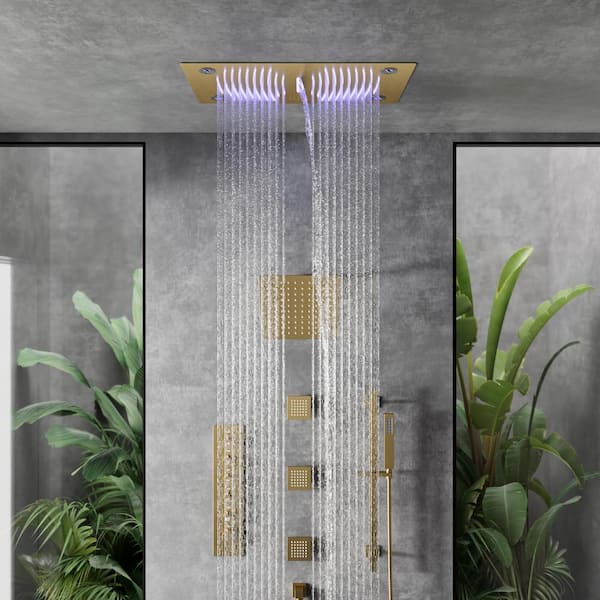 Large 63-Spray 28L in. and 8 in. Dual ShowerHead Ceiling Mount Fixed and Handheld Shower Head in Brush Gold 2.5GPM