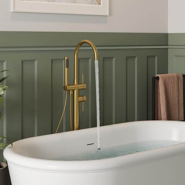 Single-Handle Freestanding Tub Faucet Floor Mounted with Handheld Hand Shower in Brushed Gold