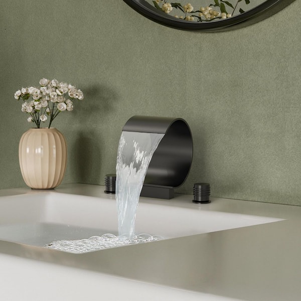 Waterfall Curved Spout 3-Hole 8 in. Widespread 2-Handle Bathroom Faucet in Matte Black Pop-Up Drain Included
