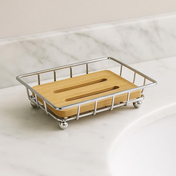Bath Metal Wire Soap Dish Cup with Bamboo Tray Brown
