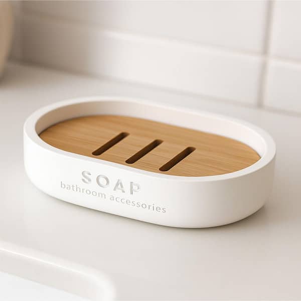 WILLIS Freestanding Soap Dish with Draining Bamboo Insert White