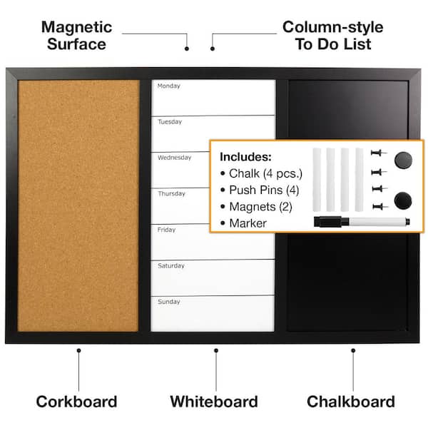 Excello 23.5 in. x 15 in. Dry Erase Chalkboard Corkboard Combo, Black