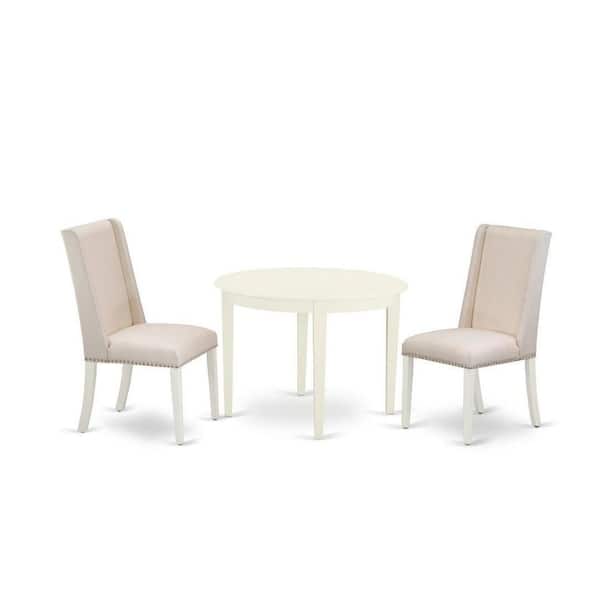 3-Piece Linen White Finish Round Solid Wood Top Dining Table Set