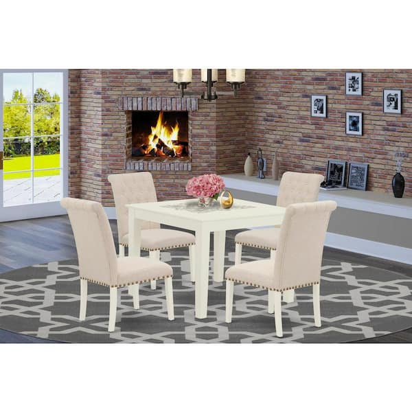 5-Piece Linen White Finish Solid Wood Top - Square Dining Room Set - Seats 4