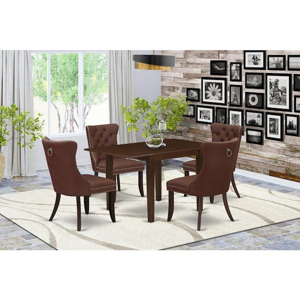 5-Piece Mahogany Finish Solid Wood Top - Rectangular Upholstered Dining Room Set with Dropleaf - Seats 4