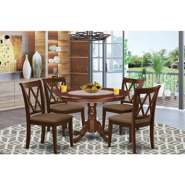 5-Piece Round Mahogany Finish Solid Wood Top Dining table with 4-Chairs with Cross Back