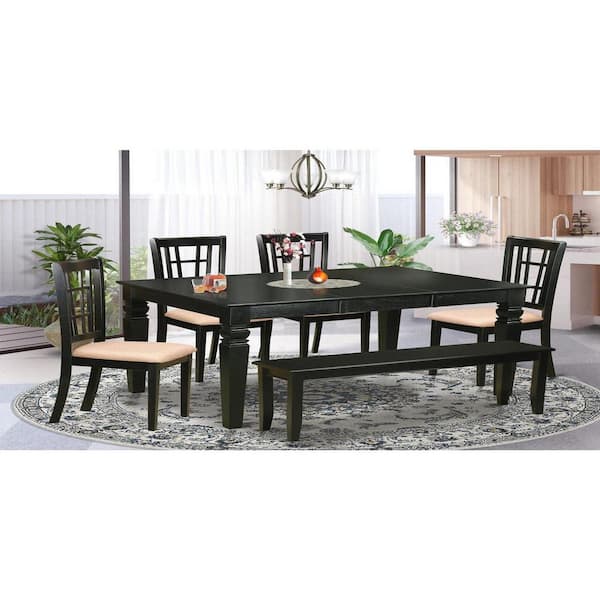 6-Piece Rectangle Black Finish Solid Wood Top dining Table with 1 Bench and 4 Chairs with Lattice Back