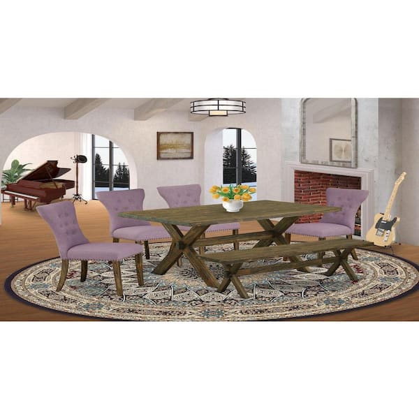 6-Piece Rectangle Distressed Jacobean Finish Solid Wood Top Dining Table with 1-Bench, 4-Chairs with Lattice Back