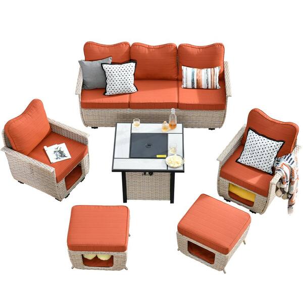 Echo Beige 6-Piece Wicker Outdoor Multi-Functional Patio Conversation Sofa Set with a Fire Pit and Orange Red Cushions