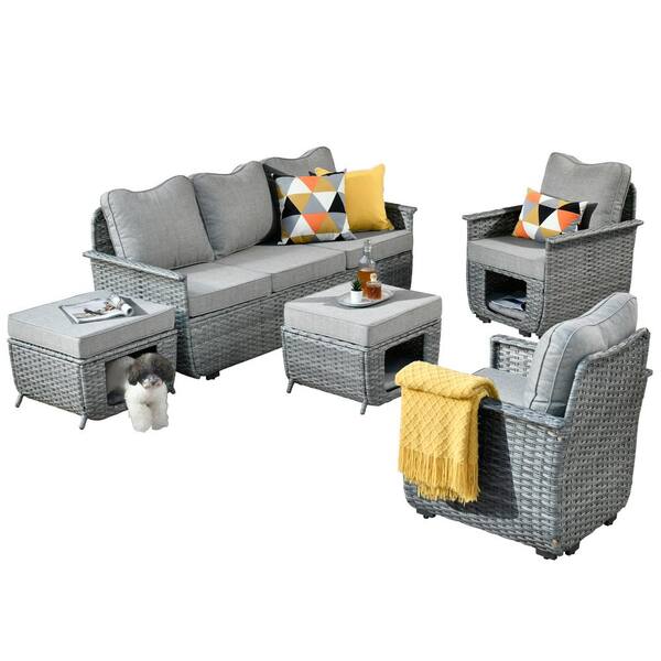 Echo Black 5-Piece Wicker Multi-Function Pet Friendly Outdoor Patio Conversation Sofa Set with Dark Grey Cushions