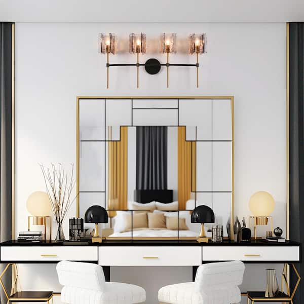 Echonalyri Modern 4-Light Matte Black and Plating Brass Vanity Light with Geometric Gray Textured Glass Shades