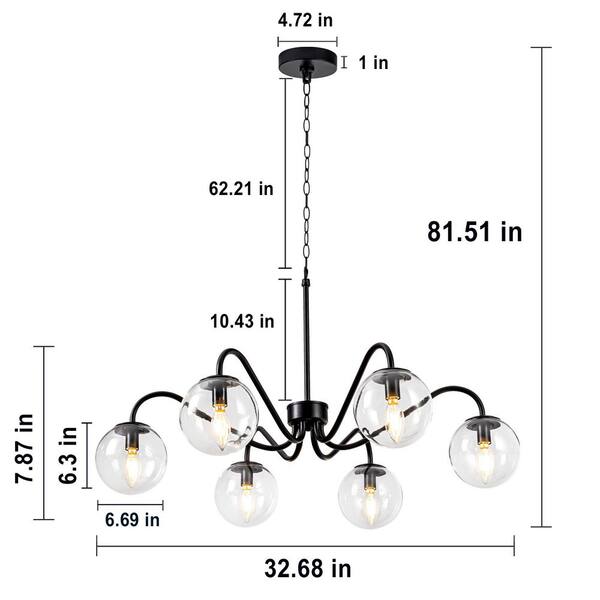 Eclipse Series 6 Light Black with Clear Glass Globes Industrial Round Chandelier for Living Room with no bulbs included