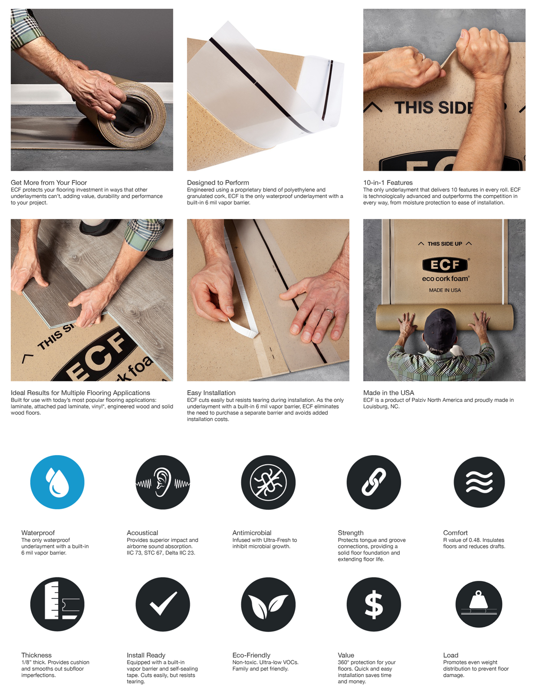| Flooring Material Features | Cushioning,Sound absorbing | Antimicrobial,Attached vapor barrier,Cushioning,Moisture resistant,Mold/mildew resistant,Radiant heat,Self-leveling underlayment,Sound absorbing,Soundproof,Waterproof | Attached vapor barrier,Cushioning,Moisture resistant,Mold/mildew resistant,Sound absorbing | Moisture resistant,Mold/mildew resistant,Sound absorbing,Waterproof,Waterproofing membrane |