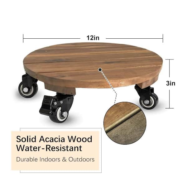 2-Pack 12 in. Round Plant Wood Caddy for Heavy Duty Plant Stand with 360° Lockable Wheels, Solid Acacia Wood, Brown