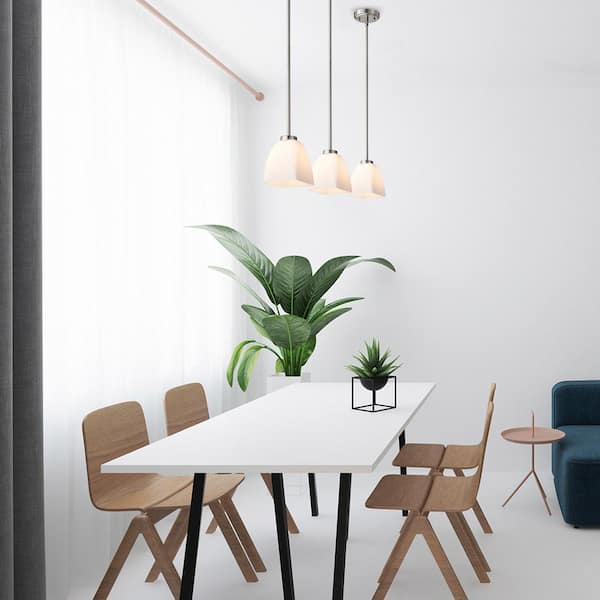 • Clean look with pyramid shaped etched white glass shades